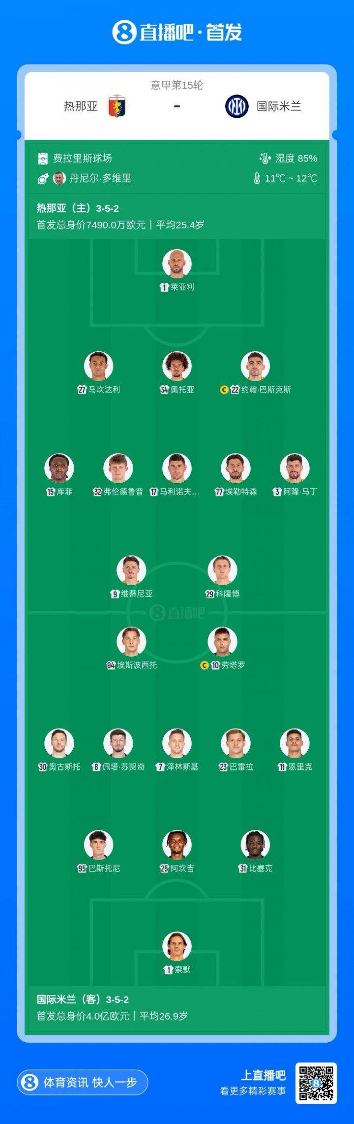 热那亚首发:1-莱亚利、27-马坎达利、34-奥托亚、22-约翰·巴斯克斯、15-库菲、32-弗伦德鲁普、17-马利诺夫斯基、77-埃勒特森、3-阿隆·马丁、9-维克托·维蒂尼亚、29-科隆博