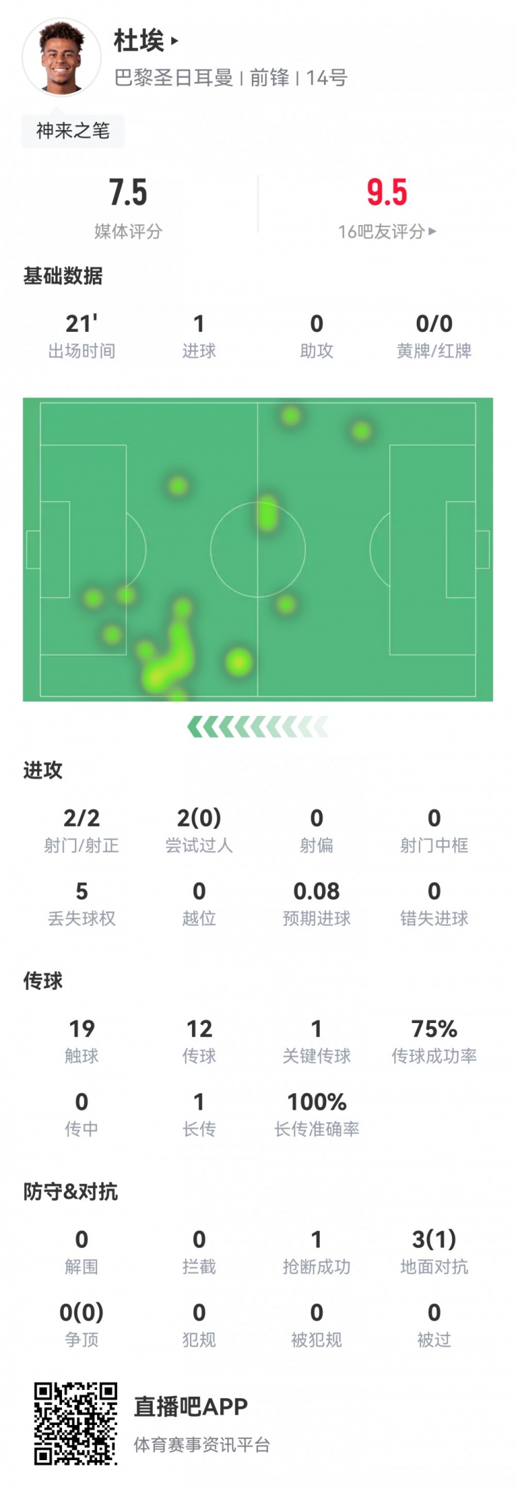 2月18日讯 欧冠淘汰赛附加赛首回合,巴黎半场让二追二2-2摩纳哥。此役杜埃上半场替补登场21分钟,球员半场重点数据如下↓