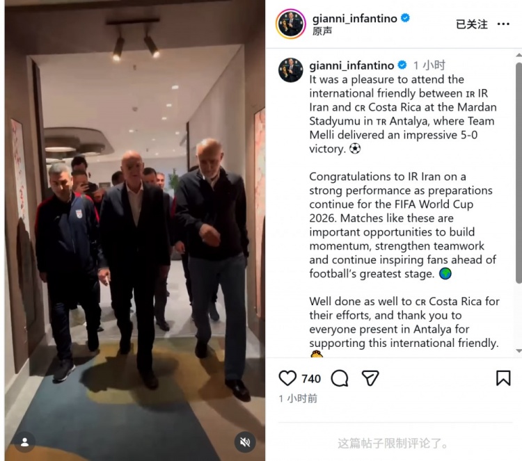 因凡蒂诺现场观看友谊赛伊朗vs哥斯达黎加,社媒祝贺伊朗取胜